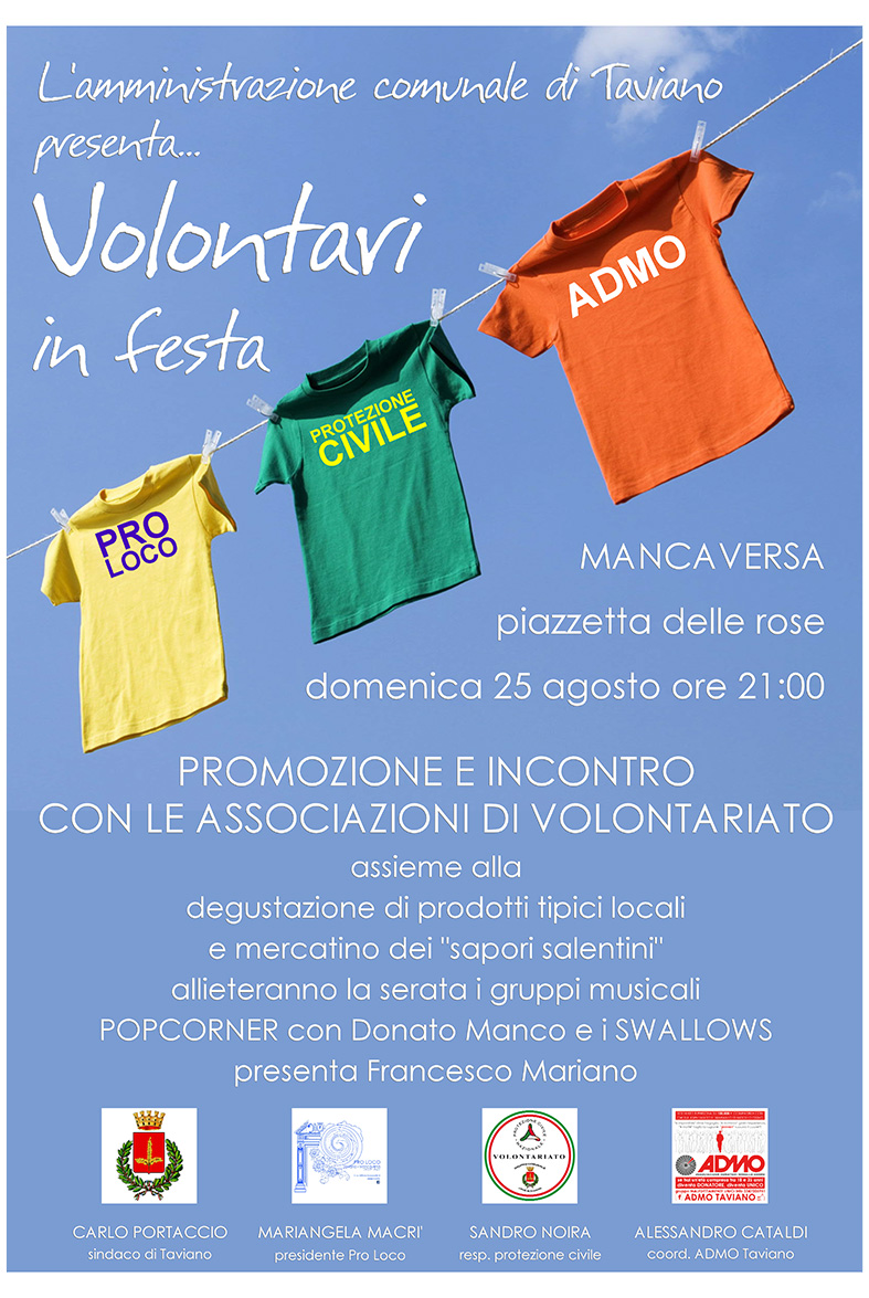 L'Amministrazione comunale presenta "VOLONTARI IN FESTA" - Domenica 25 agosto (ore 21:00) Piazza delle rose in MANCAVERSA Promozione e incontro con le Associazioni di Volontariato - assieme alla...
